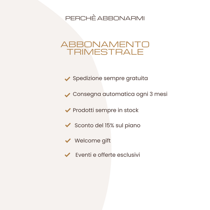 I codici sconto non sono cumulabili con gli abbonamenti, ma ricorda che avrai sempre la spedizione gratuita e uno sconto del 15% per il piano trimestrale.